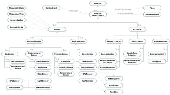 Figure 5. Smart-object context sub-ontology. - The QoS Context describes the quality of any mobile-based application, which can be represented in our ontology, which is defined as a set of metadata parameters. These QoS parameters are: (1) continuity of service; (2) durability of service; (3) speed and efficiency of service; and (4) safety and security (see Figure 6).