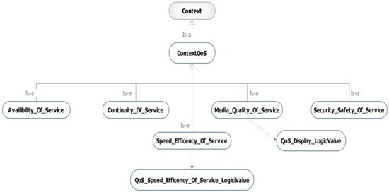 Figure 6. QoS context sub-ontology. - The Host Context represents different hosts of services proposed by providers. For example, services can be hosted on local devices or on the cloud. The local device class contains information about fixed devices or mobile devices. Mobile devices have limited resources, such as battery, memory and CPU. The Cloud class contains information about the cloud server (e.g., Google cloud) that can be used for hosting services. The service is deployed and migrated on the host, and as the service has constraints, so a substitution of the service location could occur (a possible scenario is when the battery level is low, the service should be migrated on the cloud, so that the data could be stored separately and that could help minimize the use of energy). As mobile limited resources can break the mobile services, we are looking to the cloud or resources in proximity as a way to ensure the service continuity on mobile devices (see Figure 7).
