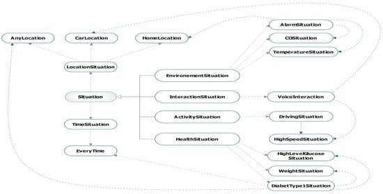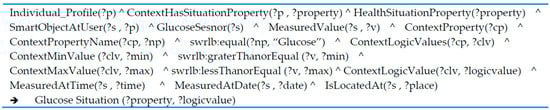 SWRL as a rule-based context inference language is used to infer situations that are related to the user’s environment and user’s devices, such as home temperature situations and battery situations. Each situation has data type properties (see Figure 15), such as situation type, max value and a min value, that are defined by the developer and by the domain expert; in our work, the physician. For example, the High Blood Sugar Type 1 situation is a blood sugar situation that can have “High Blood Sugar Type 1” as a type, 1.45 as the min value and 2.5 as the max value.