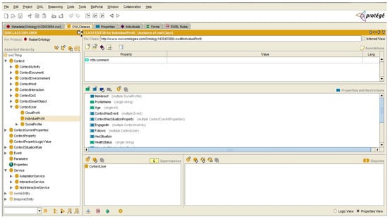 Firstly, based on OWL languages, we have implemented our ontology model using the Protégé tool. Protégé [] is an open-source platform that provides a growing user community with a suite of tools to construct domain models and knowledge-based applications with ontologies. In addition, it implements a rich set of knowledge-modeling structures and actions that supports the creation, visualization and manipulation of OWL ontologies (see Figure 14).