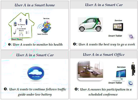 User A is a diabetic person and needs to monitor his or her health. He or she uses an intelligent environment, which includes smart devices, sensors (glucose meter, weight scale, video camera) and services. This intelligent environment specifies an ambient system that allows him or her to live safely and to identify urgent situations. For example, the situation of “diabetic coma or too high temperature” is deduced by referencing the average glucose level and the temperature level in the profile. To make better informed choices, to help User A manage his or her situations in a more practical way by User B (e.g., doctor) (see Figure 17), User A needs to check his or her blood sugar level. He or she uses a bio-sensor that connects to his or her smart phone via Bluetooth technology. According to his or her blood sugar level, the system will execute the appropriate service. If his or her blood sugar level is out of the normal range determined by his or her doctor, there will be three possible situations (see Table 3). When “User A” takes a shower, he or she activates the faucet, and the “Adjusting water Temperature” service will be executed automatically in order to adjust the water temperature. When “User A” has breakfast, he or she reads his or her personal emails, and so, the email app is deployed and launched, whereas the previous “Adjusting water Temperature” service is removed silently. As he or she enters his or her car, the GPS is automatically connected to the phone; the mail app is automatically enhanced to integrate the vocal reading email functionality, whereas a traffic guide is launched and indicates the best way to go to work. He or she preferred to translate text to speech (see Table 4). As he or she is a bit late, an audio conference is dynamically deployed in order to ensure his or her participation in a scheduled conference that he or she has to attend. When entering the office, the audio conference is migrated to the desktop PC, and the video functionality is added to continue the discussion. In his or her smart office environment, when the system detects abnormal situations representing too high temperature and too low humidity, the “Fire Station Call” service is automatically triggered, and the service notifies the emergency status to the nearby fire station (Table 5).