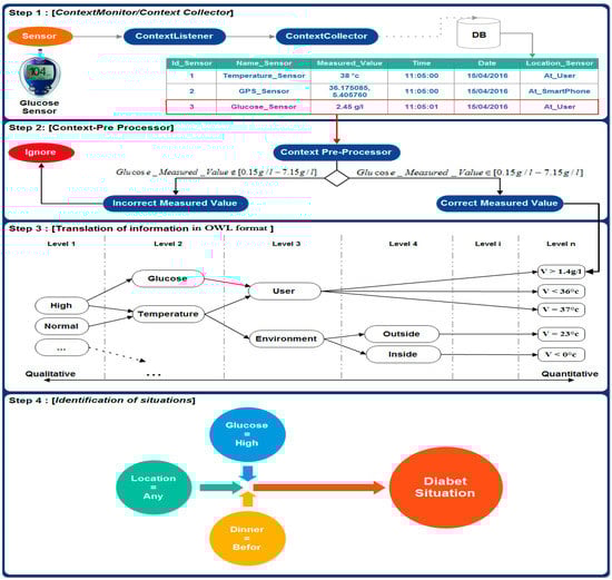 A first simple scenario is made of a User A, which is at home using a Samsung smartphone. User A can use our platform to monitor his or her health in a more practical way. He or she uses an intelligent environment (smart home), which includes smart devices, sensors (glucose meter, weight scale, video camera) and services. As proposed in our architecture, the principal role of the Context Monitor is to supervise User A in order to detect abnormal situations. The Context Monitor collects and preprocesses context information from the smart sensors and stores it in a database. Then, it represents and reasons about this context using our ontology and Context Reasoner in order to deduce the current situations that are reported to the Service Controller. The latter is responsible for providing the appropriate service to the user according to the inferred situations. In fact, as illustrated in Figure 18: (1) contextual information is collected from the smart home by the Context Collector, and it is stored in a database; this means that the information simulated via the prototype interfaces is stored automatically in a database; (2) this information is pre-processed by the Context Pre-processor and (3) converted into a triple pattern in OWL format and inserted in our ontology by the Context Translator; then, (4) the Context Reasoner uses the Situation Inference Engine, which is based on JESS, which executes the Situation Rules presented in Table 2 (translated in SWRL by Constraint Translator) and infers the current situations. These situations are transmitted to the Service Controller.