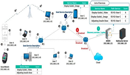 Once an abnormal situation is identified, the ASSACR is responsible for discovering available services around the user location. This is done thanks to the SNMP protocol and the middleware Kalimucho server side offering such a service; the ASSACR uploads different available services’ profiles and starts semantic service matching that fulfills the user context and preferences according to Equation (1) (Section 4.2). User A is looking for a quality multimedia health service with low cost with implicit constraints: the screen resolution of the smartphone is limited to = 400 × 600, which is less than the document video. Now, studying both local and remote service results and taking into consideration the user preferences, the degree of the similarity is always high if the set of context attributes suggested by the health service and requested by User A is great, no matter the number of attributes provided by the service, but not asked by the client. Three available health services with different modalities with different multimedia contents across User A’s location are as depicted in Figure 20. We used [] for classifying the relevant interactive services that have a potential benefit. It takes into account the usage domain (the list of devices that the user can access or control in a certain situation or context) to illustrate the multimodality aspect and finds the appropriate device. Table 6 shows the evaluation results, meaning that the service orchestration “Adjusting Insulin Service (User E) + Display Guide1 Video (User E)” is selected as the best orchestration service. This selection is based on the high score compared to other paths because the preference desired by User B is satisfied by two neighbor users (User C and User E), but User E is top classified because of the available laptop resources. The ASSACR plugs in the “Adjusting Insulin Service Client and Display Guide1 Video (User E)” and invokes the service.