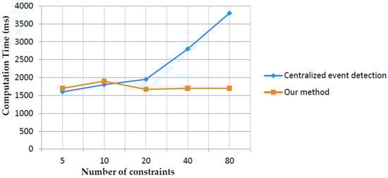 The comparison of the computation time between our distributed event detection and the centralized/distributed event detection in terms of the number of constraints.