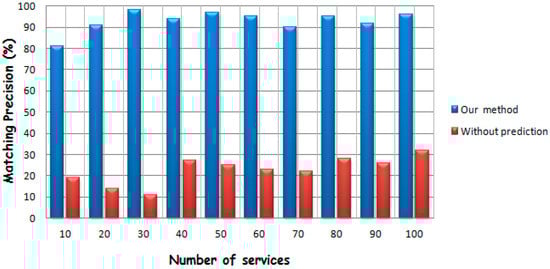 To evaluate the matching accuracy, we compare the probability of the high quality service matching precision with/without the prediction strategy. The repository of services increases from 10 to 100. The system is modeled as a Poisson-process, and each mobile device’s CPU speed is initialized with a random value in the range of [100, 800] and reduced automatically by a random value in the range of [0, 5]. We gathered results consisting of services in the Kalimucho server and the number of services selected from the Kalimucho server and deployed locally and/or in nearby devices. As we can see in Figure 22, in the majority of the cases, the selection frequency of the predicted services was higher than the probability of their selection without the prediction strategy. For example, with a repository size of 50, the probability of its selection was about 95% using our prediction strategy. Any modifications to those complex user contexts may require less checking time, thus increasing the flexibility of the user applications.