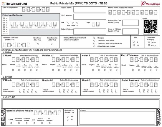 - Timimi, H.; Falzon, D.; Glaziou, P.; Sismanidis, C.; Floyd, K. WHO guidance on electronic systems to manage data for tuberculosis care and control. J. Am. Med. Inform. Assoc. (JAMIA) 2012, 19, 939–941. [Google Scholar] [CrossRef] [PubMed]