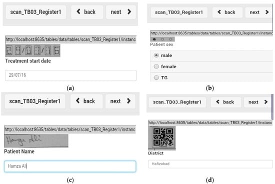 Open Data Kit (ODK) Scan is an Android-based mobile application and a part of the ODK 2.0 suite of tools [,]. It uses the device’s built-in camera to capture an image of a scan-compatible paper form, which it feeds into a series of image processing algorithms (SURF, fast approximate nearest neighbor, and RANSAC) to establish a point-by-point mapping between the template and the captured image [,,,]. Using this mapping, Scan segments the form into small image snippets that each contains a single data field from the original form []. The image snippets fall into three possible prompt types: hand-filled bubbles, structured number boxes, and QR codes. Hand-filled bubbles are multiple-choice questions that are completed by filling in the bubble that corresponds with the desired response. Scan classifies hand-filled bubbles using a Support Vector Machine (SVM) and principal component analysis (PCA) [,,]. Structured number boxes are a 2 × 3 grid of dots that can be connected by straight lines to draw numerals. Scan classifies numbers using a Multi-layer Perceptron (MLP) with back propagation of error []. Finally, QR codes are two-dimensional barcodes that can be processed as alphanumeric strings. Scan uses the Zebra Crossing (Zxing) library to classify QR Codes []. After Scan has classified each prompt, it inserts the data into an editable record in the ODK 2.0 database. Each digitized field includes a copy of its associated image snippet from the original form, which can be used to verify digitized fields. Once the record is in the ODK 2.0 database, users can use the other tools, such as ODK Survey and ODK Tables to view, edit, verify, aggregate, and sync the data or create customized services, interactions and reports with the data [].