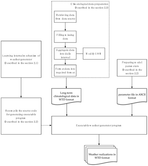 In this section, we describe the general procedures in preparing climate data for running legacy weather generators. These steps must be performed often manually, as illustrated in Figure 1 in the part of climatological data preparation. From the retrieval of data (from a data source), one needs to learn the data accessing protocol and format. After retrieving the data, all missing data need to be filled, as weather generators cannot process a dataset with missing data above a threshold volume. A weather station captures weather data at various time-intervals. In the case of public weather station networks, they usually publish their daily data, but some stations capture data at every 5- or 10-min intervals and publish those data as they are. In such cases, the data must be aggregated at daily interval and their unit of measurement (UOM) must be changed accordingly. Matching the UOM of each climate variable is very important; otherwise, there could be some hidden errors in the final dataset. Lastly, the aggregated daily data must be transformed in formats compatible with weather generators.