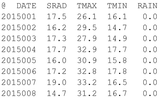 Most weather generators and crop models require daily weather data as inputs. ICASA standard format provides a basis for writing daily weather data (WTH) [16]. WTH format is written in plain text, with special syntax and formatting rules (Figure 3). The weather generators used here accept daily weather data in the same format as WTH file (yearly), and longer-term (multiple years) weather files (WTD or WTDE file). Weather file in WTH format is used in Decision Support System for Agro-technology Transfer (DSSAT), one of the most popular crop simulation platforms used today.