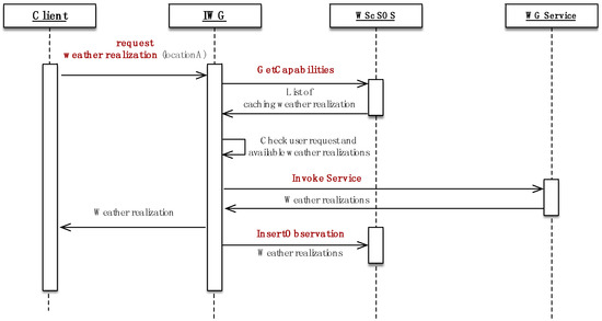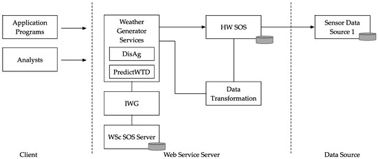 Based on 52°North’s SOS package [35], we developed historical weather service, hereinafter referred to as HW SOS, to provide weather sensor observations via standard SOS operations and data format. HW SOS acquires possibly incomplete climatological data from external sources through cloudSense [32], and then fills missing data so that weather generators can obtain complete datasets. In the case of missing data, a component for filling missing data is implemented internally in the HW SOS. It searches for a date with missing data and fills it with nearest data available of the same DOY. Standard methods for filling missing data include nearest neighbor (as implemented in this service) and geospatial interpolation, among others. This service provides data for both internal use and external use. Internal use means it supplies long-term climatological data to weather generator in order to generate weather realization. For external use, users can directly call this service for receiving historical weather data or climatological data through SOS API. Moreover, HW SOS can also serve external SOS users via standard and public SOS API. When someone wants to connect a data source to the framework, a new HW SOS Server component will be generated. The component initially connects to the data source at design time, then specific data, in this case, location and time span, have to be identified at runtime.