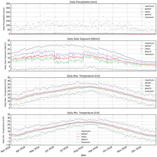 Climate variability impacts crop growth. Climate data are used for simulating crop growth, planning agricultural management and farm decisions [12]. Crop models use daily meteorological data as inputs for simulating crop growth [13]. The key variables that impact crop growth are temperature, solar exposure and precipitation [14]. Temperature substantially affects crop growth and phenological development, while solar exposure significantly affects crop photosynthesis [15]. Precipitation represents water availability in an area. These variables are often generated in a weather generator.