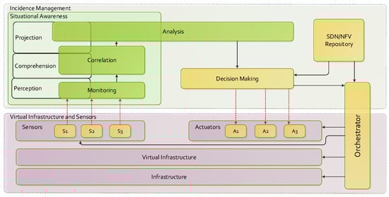 To the best of our knowledge, there are few studies that survey Security and Risk Management in 5G Networks. In [], a context aware framework for the next generation of Mobile Cloud Network (MCN) is proposed. This work introduces a “Context Generation and Handling Function” to provide enriched processing information from radio and core elements, taking into account two key-enabled 5G technologies (SDN and NFV concepts). Meanwhile, a recently published threat report has been conducted by the European Union Agency for Network and Information Security (ENISA) []. This work reviews the potential security in SDN/5G networks, considering not only SDN but also NFV and Radio fields. This report identifies the network assets and the security threats, their related challenges and risks. It also describes the existing security methods and provides good practices for 5G systems. These works could be considered part of the initial research of 5G Security Management. However, these are limited in scope. On one hand, the ENISA Report [] identifies only the assets and threats to SDN/5G environments (no architecture proposal has been done). On the other hand, Marquezan et al. [] propose a single network function that monitors radio and access elements but doesn’t take into account other 5G components such as virtualization or application layers. Meanwhile, the 5G-Ensure Project is intended to cover security requirements in 5G Networks. The proposed architecture will provide a trustworthy 5G system, offering reliable security services to customers by means of the development of a set of non-intrusive security enablers such as privacy, security network management, and trust, among others []. As part of its proposal, 5G-Ensure defines a Risk Assessment and Mitigation methodology in order to evaluate security concerns in 5G systems, based on NIST-SP-800-30 and ISO 27005 standards []. Although 5G-Ensure covers a wide range of security issues on 5G Networks, this project is still at an early stage and does not keep in mind the concept of actuators, which have been introduced in our proposal in order to mitigate possible risks and deploy corrective measures. This article introduces a novel architecture for incident management on 5G Mobile networks, which combines the foundations of the traditional risk management guidelines with the Situational Awareness model published by Endsley. It covers all layers of information processing in 5G networks, from the infrastructure to the actuators responsible for implementing mitigation actions. The basis for the identification, monitoring, analysis, decision-making, prediction and countermeasure tracking are also introduced. The paper is divided into six sections, the first section being this introduction. The risk management systems, Situational Awareness and the related work are described in Section 2. The challenges posed by 5G networking related to risk management are explained in Section 3. An architecture that combines traditional risk management and Situational Awareness for 5G is detailed in Section 4. The componets to carry out analysis and decision-making processes are described in Section 5. Finally, conclusions and future work are presented in Section 6.