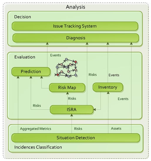 Incident management based on Situational Awareness has been implemented in very different areas, among them smart grids [], power generation [] or vehicular collision avoidance systems []. In [], a method for defining the critical information and the relevant information quality elements that are required to build the Shared Situational Awareness (SSA) in disaster response is suggested. The adaptation of the Endsley has proved particularly effective in complex and dynamic environments [], where the diagnosis is highly dependent on the context in which incidents are reported, reaching to play an essential role in the fight against cybercrime. Many of these contributions are collected in [], where the predominance of issues related to risk management in emergency situations, industrial systems and networks is observed. As discussed in [], they improve the three most repeated deficiencies of the Information Security Risk Management: (1) Information security risk identification is commonly perfunctory; (2) Information security risks are commonly estimated with little reference to the current situation; and (3) Information security risk assessment is commonly performed on an intermittent, non-historical basis (a conventional security risk assessment scheme can only give a “snapshot” of the risks of the information systems at a particular time []). In order to bring solutions to these problems, but without losing focus on the ISRM/ISRA basis, several publications approach the combination of both paradigms. This is the case of [,], where the Situational Awareness is acquired, taking into account the definition of risks, assets and their impact posed by the different standards and platforms for ISRA implementation [,,,,].