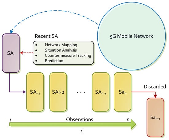 Prediction facilitates the anticipation of future complications, such as congestion of certain network regions, inclusion of large amounts of new assets or spreading of cyberattacks. The general scheme for forecasting SA studies variations on their contents by modeling the sequence of observations as time series, as it is shown in Figure 4. Each observation includes information about every SA feature, such as the network map, risk levels or recent incidents monitored over a period of time. Because of this, the prediction module is not only capable of anticipating particular situations, but also the whole future SA, thus providing general and particular overviews about everything that occurs in the system. Note that the observations are delimited by a fixed period of time. A common alternative to this fixed value is to consider more specific features, such as workload or number of situations reported. Both cases imply advantages and disadvantages, but the delimitation by time periods poses a more intuitive method. In order to avoid overloading of storage systems, after a reasonable period, the oldest observations are discarded to make way for the new ones. In this way, a sliding window of size N that gathers the observations is applied. This boundedness is important for ensuring that the implemented algorithms are computable, avoiding the case N (i.e., the worst case), which leads to holding an infinite amount of information.