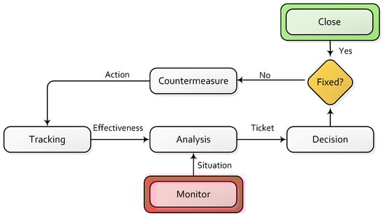 The countermeasure tracking component conducts comprehensive monitoring of the actions proposed by the decision-making modules for dealing with situations. This allows for identifying ineffective countermeasures that may lead to new diagnosis or prevention of counterproductive situations. On the other hand, the countermeasure tracking stage allows for the development of an immune memory. Therein, all situations that have been resolved or are being processed are stored. This allows knowing how a problem was previously solved, offering added value to the decision-making. In addition, it provides information about all similar problems that are being processed, which may facilitate the correlation of incidences. In order to enhance the countermeasure tracking tasks, the proposed architecture implements an Issue Tracking System (ITS). The ITS assigns a ticket to every situation tracked in the protected environment. Tickets are running reports on a particular problem, which contains their nature, history and other relevant data. They are continuously analyzed to provide real-time status of the situation, and they record all the countermeasures implemented over time, as well as their effectiveness. The ITS is illustrated in Figure 6, where the original situation to be treated is provided by a use case, or it is detected from the network map. Then, the incident is analyzed, and a token with the results is sent to the decision stages. If countermeasures should not be applied, the ticket is close; in this case, it is assumed that the problem is fixed, and the solution is stored in the immune memory. Otherwise, countermeasures are applied. Then, the evolution and effectiveness of such actions are studied and added to the ticket history field; as in the previous case, the progress is also stored in the memory. The resulting ticket is sent back to the decision-making module, and this process is repeated until the problem is fixed.