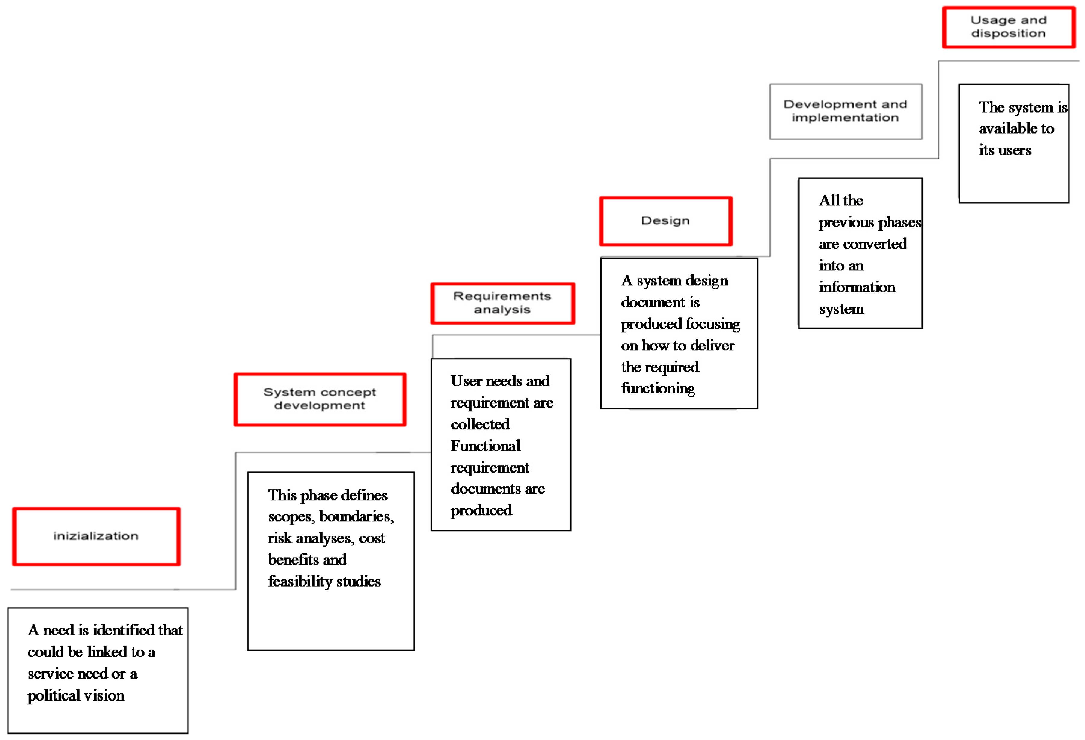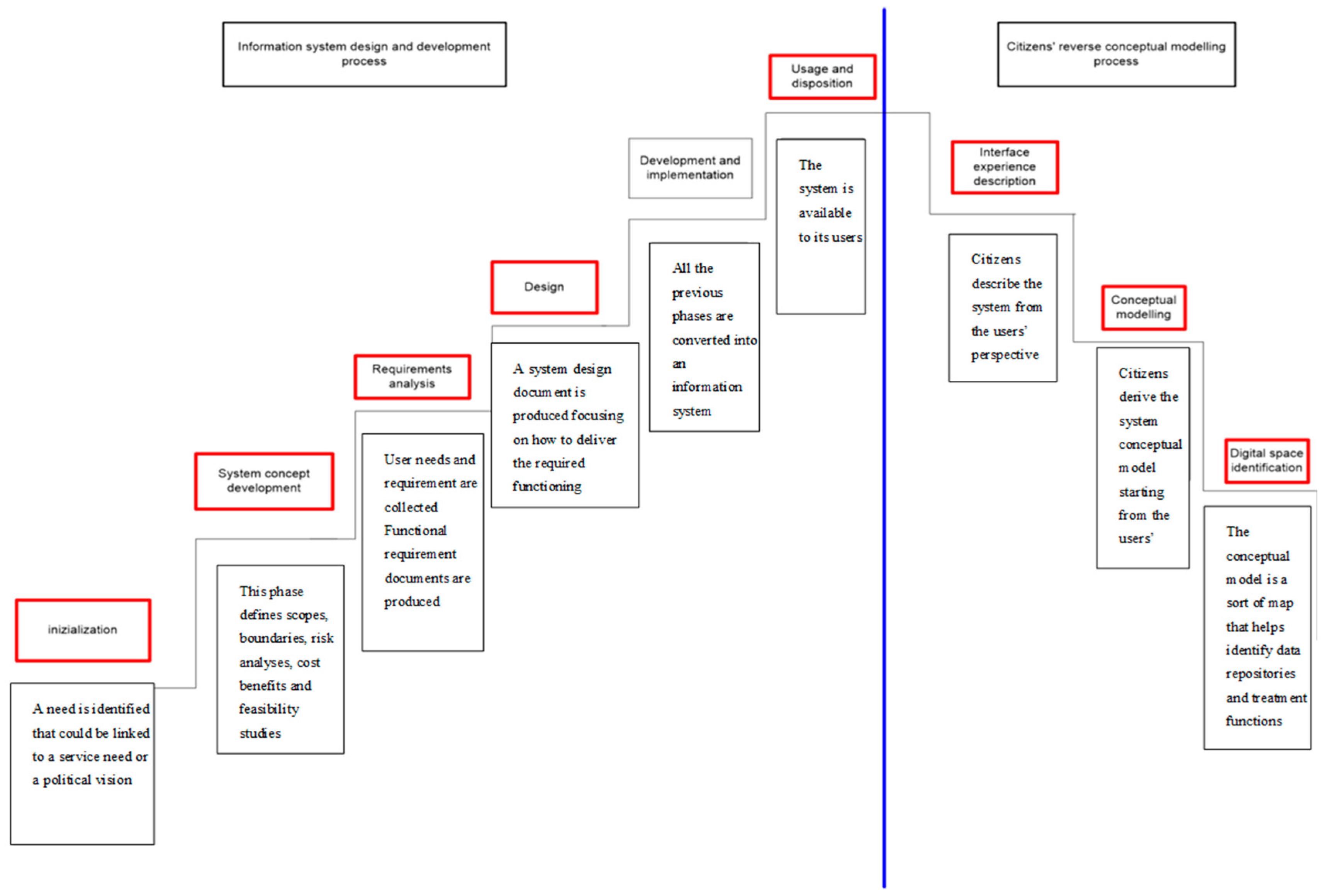 Speaking of public services, for example, initialization could be a political phase in which citizen involvement is usually very high. System design may include dominion-experts: media and public opinion may demand information feedback. The figure shows that due to language and technical barriers, development and implementation are the only processes totally outside the citizens’ comprehension.