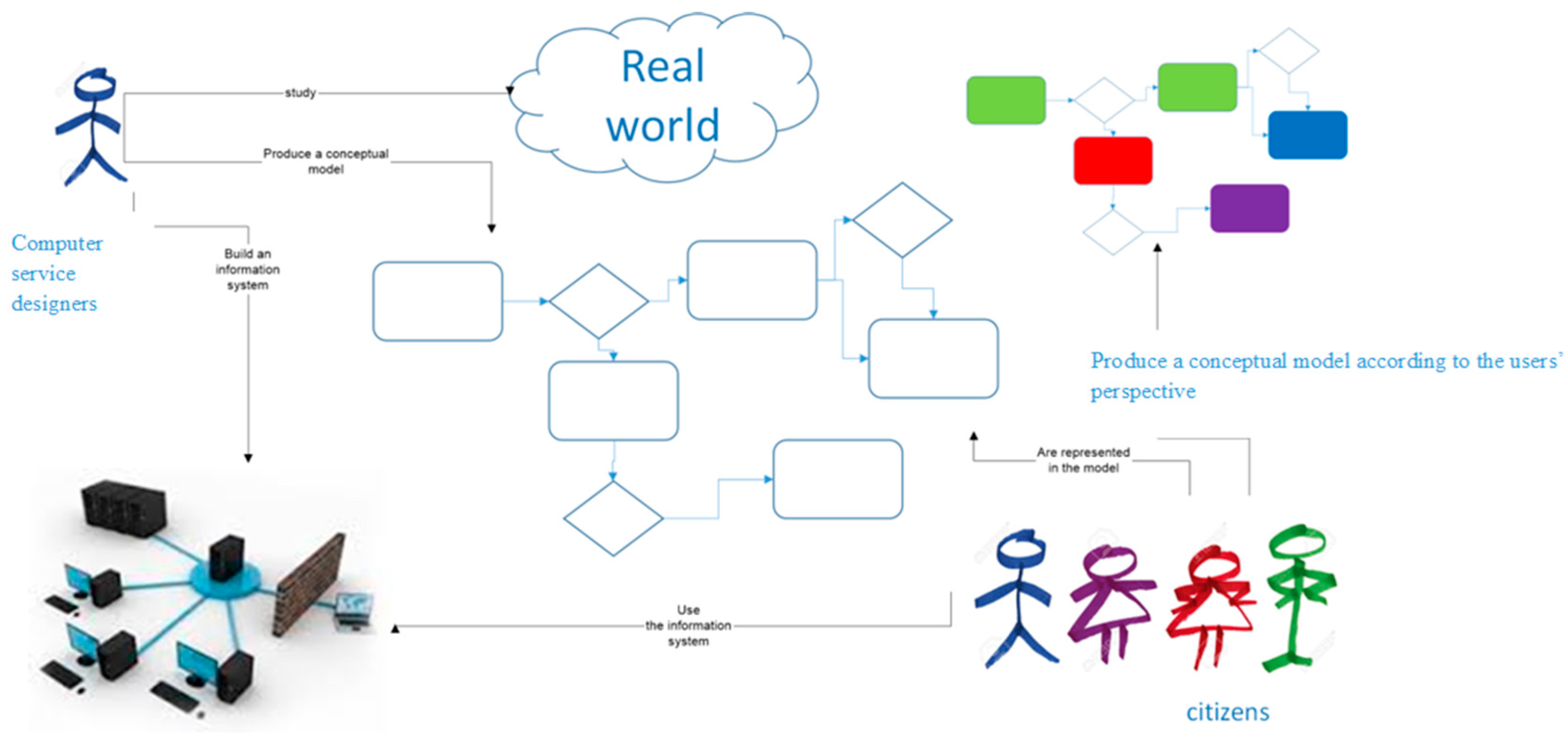 Citizens, as system users, are represented in the model: to provide the services, their data may be collected and integrated with other sources. They use the system through dedicated interfaces and often interfaces are their only perspective; the picture shows how a simplified system conceptual model draft may be derived from the users’ point of view.