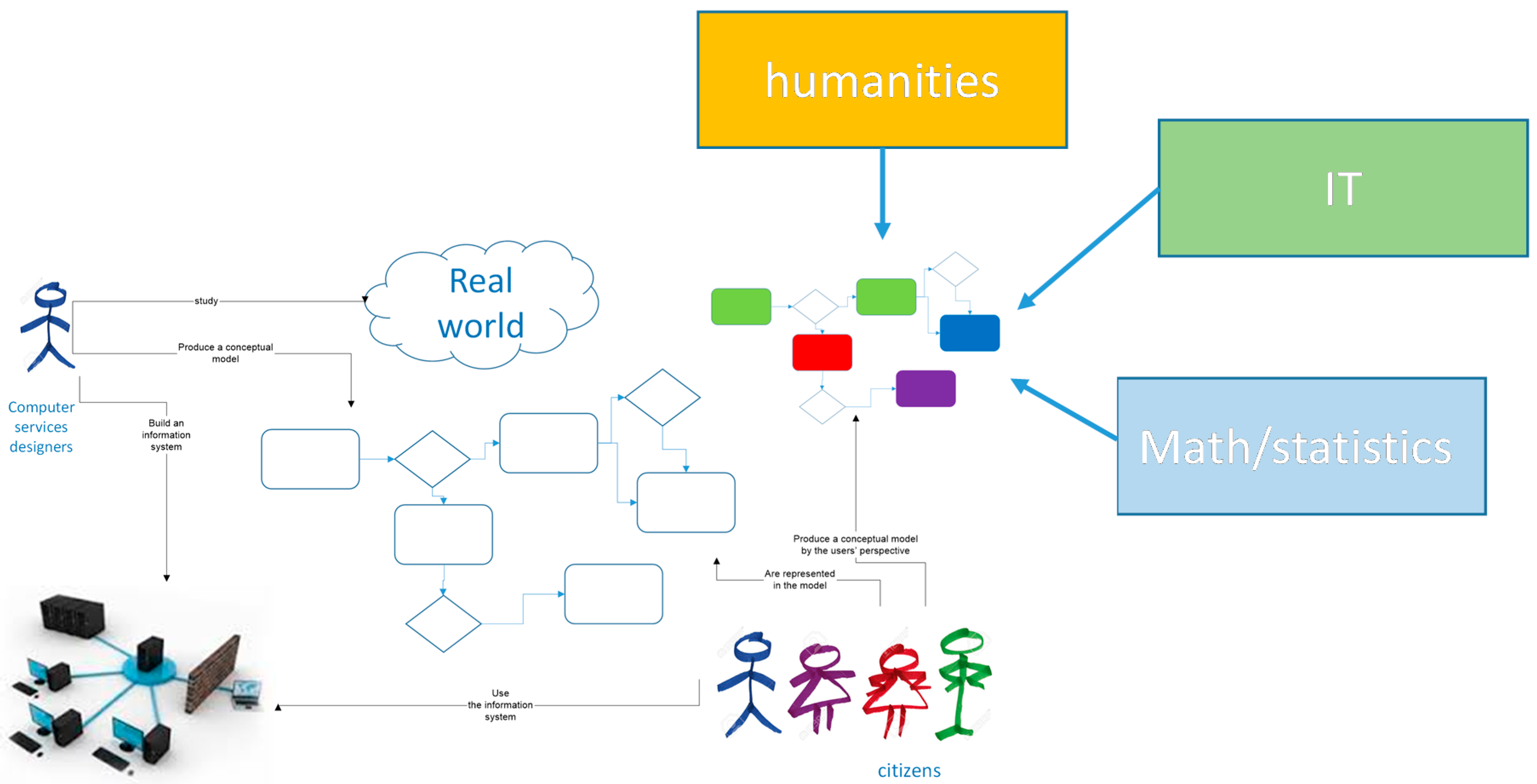 Information systems are usually developed in line with the methodology sketched in the following image: the boxes with red borders have, to a certain extent, been developed in natural language and, if properly arranged, they may even be up to non-skilled citizens.