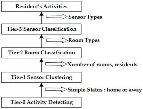 Tier-1: Sensor Clustering. It assumes that a particular sensor that is triggered during a timestamp will be very close in space to infer other sensors in the same room. In this tier, the number of rooms and people in the home can be predicted.