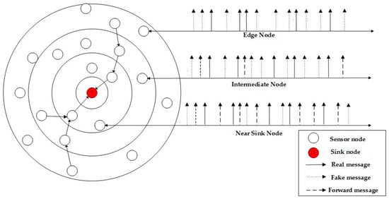 To reduce the delay of data transmission, the transmission interval should be reduced, resulting in a high traffic load, as well as a significant increase in the probability of collision. As Figure 2 shows, in an actual sensor network, the closer it gets to the sink node, the larger the amount of data that needs to be forwarded. If all of the sensor nodes send fake messages following the same model, the nodes that are closest to the sink node will have to assume a load which is too heavy to forward messages. In our method, a sensor node will adapt to its own network status when sending fake messages, i.e., a node will add a lower number of fake messages when the forwarding load appears to be heavy. Such an approach would result in the three types of nodes consuming energy at a more balanced level, prolonging the life of the network in comparison to other models.