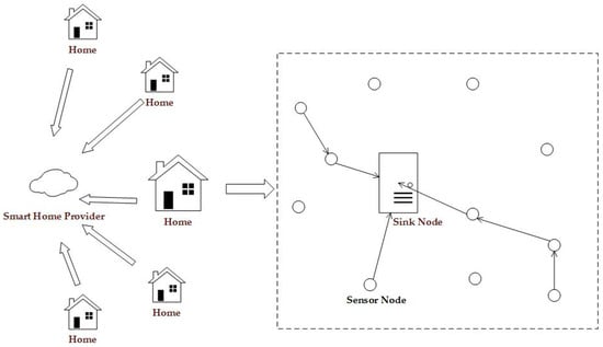 Similar to other WSNs [], nodes in smart home consist of the sink node (only one sink node in the sensor network) and sensor nodes N = . As shown in Figure 3, the smart home provider is a reliable service provider who can collect and analyze data from many homes. The sink node has a high enough computing power to take on complicated operations. The sensor node is the smallest unit in the WSN, and has a limited computing power and limited battery capacity. Sensor nodes can apply encryption algorithms to encrypt collected data [], before sending it to the sink node. We assume that the encryption algorithms used are safe enough and that the attacker cannot acquire the original data through analyzing the cipher texts. We also assume that the sink node is actively powered, while being equipped with tamper-resistant hardware []. Consequently, it is reasonable to assume that the adversary cannot compromise the sink node.
