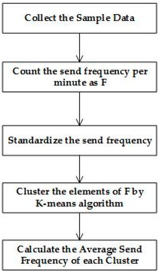 Taking into account the different habits among people in different regions, the provider should include sample data from different regions in the analysis, and the procedure is shown in Figure 4. Firstly, we should count the number, as well as the time of message sending per minute, for which the answer is denoted as F = . Then, we will use formula (1) to standardize , for which the answer is denoted as F^' = . Secondly, we use the K-means clustering algorithm to cluster the elements in , producing a group of periods over the 24-hour interval. Finally, we calculate the average frequency of sending in each of the periods and update the average frequency of sending, as well as the period p to the FDR. After the analysis, we will ascertain the FDR that will be sent to the smart home devices in every family.