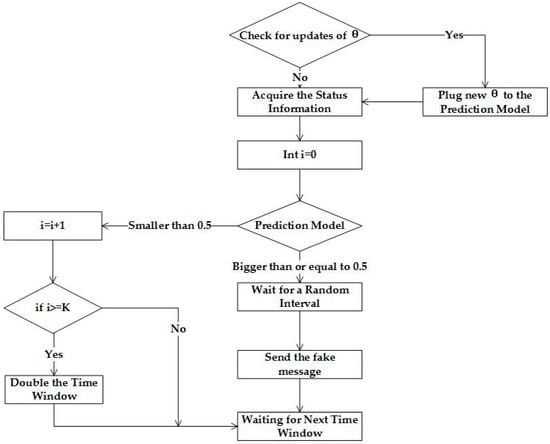 To normalize the time, we map the current timestamp in the range [0,24], which is represented using . In , the nowTimeStamp denotes the current timestamp and the dateStamp denotes the starting time of the day. These parameters are used as inputs for the prediction model. The prediction model consists of a series of operations, along with a hypothesis function. If the result of the prediction model is not smaller than 0.5, a fake massage should be sent after a random time delay. If the result is smaller than 0.5, the algorithm ascertain whether a fake message has been sent during the previous K iterations. If so, the time window will be doubled. Once real data is sent, the original time window will be resumed.