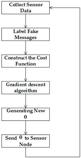 The supervised learning process is composed of three steps: collecting data, labeling collected data, and executing the learning algorithm and updating the parameters in the sensor nodes. All of the sensor nodes send fake messages in accordance with the initial time window, and the sink node labels the collected data in accordance with the FDR, as well as the traffic status. The learning algorithm will train the labeled data from different sensor nodes and the sink node will hand out the parameters to the sensor nodes.
