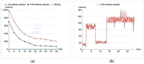Comparison of latency; (a) Description of the change of the Latency which with the change of the FVR; (b) Description of the change of Latency of FitProbRate Model which with the change of the hours in a day.