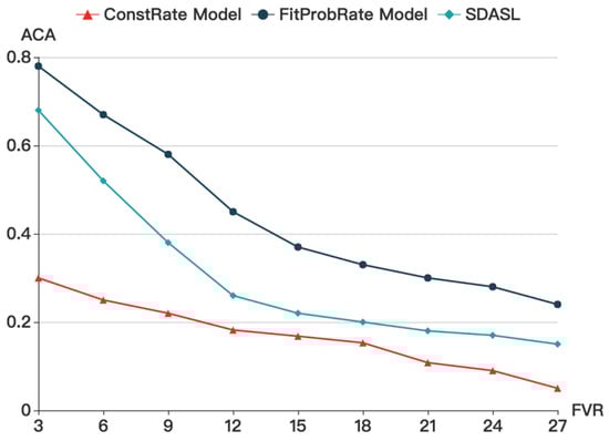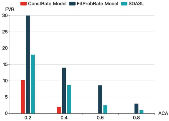 Figure 9 shows that, with an increase in FVR, the ACA gradually decreases. While in the ConstRate model, the ACA remains at a low level, it is affected by FVR in our model and in the FitProbRate model. When FVR increases, ACA declines. As in the FitProbRate model, if real events happen frequently, the overall transmission will become dense. Whereas, if real events happen sparsely, the sequence will become synchronized. Therefore, the adversary can infer the routine of the residents by analyzing the density of the transmission sequence. Accordingly, when the sequence is dense, people may be at home and pursuing activities. When the sequence is sparse, people may be asleep or at work. In our model and in the ConstRate model, this problem does not occur.