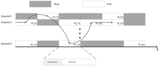 The channel model of a cognitive radio network with independent and orthogonal channels that are licensed to a primary network following a synchronous slot structure is illustrated in Figure 1. We model the channel availability as an i.i.d. Bernoulli process with mean value : , in which denotes the “free”(denoted by 1) or “busy”(denoted by 0) state at time of channel . The SUs can access the free slot, which will yield a handoff delay if they access a channel that they did not access in the previous slot.