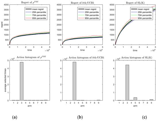 The regrets and action histogram of ρPRE (a), kth-UCB1 (b), and SL(K) (c) when .
