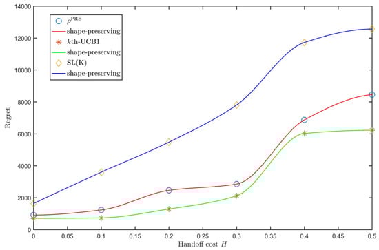We also investigated the regret of the three policies with varying handoff cost as shown in Figure 4. As handoff cost is meaningless when the value is larger than 0.5, an between 0 and 0.5 is chosen. From Figure 4, we see that the regret increases as increases. Moreover, the growth rates of the three policies are all small when , which shows that these policies perform well. However, they become considerably large when . Intuitively, this is because a large causes the arms to become indistinguishable.