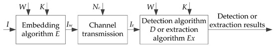 The purpose of digital watermarking is to embed obvious information into digital data. The embedded symbol is usually invisible or difficult to detect, but it can be detected or extracted by certain extraction algorithms. The watermark is hidden in the original data as an integral part of it, and general framework of digital watermarking technology is shown in Figure 1.