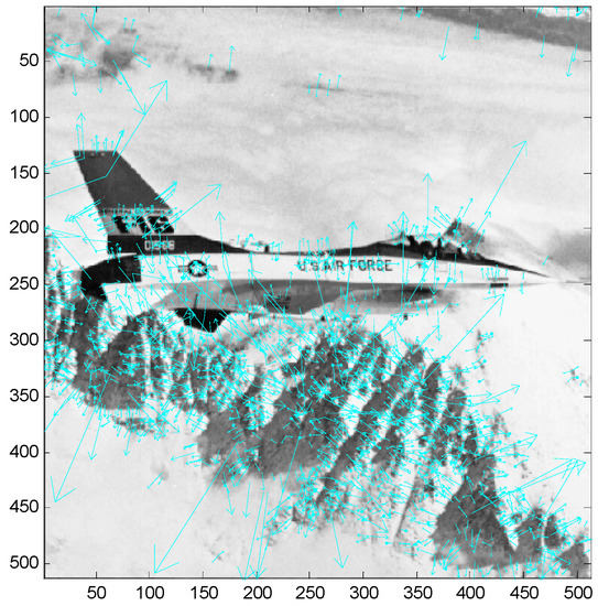 In this section, the Airplane image is chosen to embed the watermark for representation. Figure 2 represents the obtained information of feature points after SIFT. The length of the blue arrow in the host image represents the scale, pointing to the direction of feature points, and 2050 feature points are picked out by SIFT, in total.