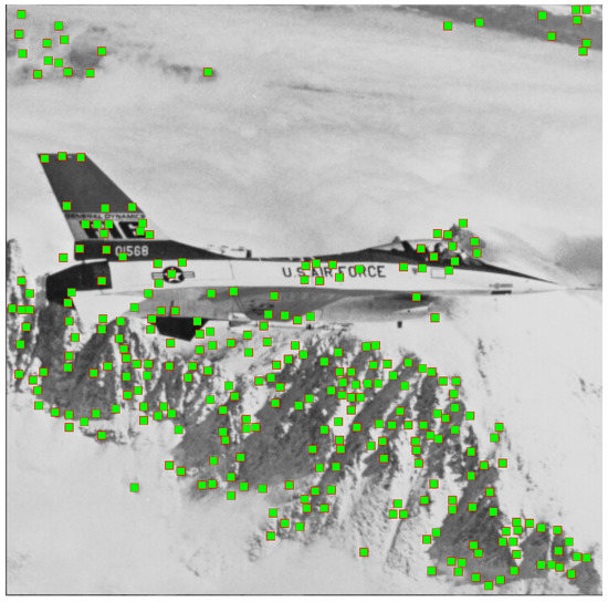 Since the scale range of initially obtained feature points are 0–50, points with larger or smaller scales may not be easily detected or successfully matched. Therefore, a certain scale range of points should be selected as candidate feature points, and points whose scale is between 2.3 and 8 are selected as feature points. Then, the 8 × 8 size of the neighborhood is chosen for each feature point to define feature regions for following operations. Additionally, feature points which are beyond the image boundary and have overlapping neighborhoods with others should be eliminated. Finally, feature points for embedding watermarks are obtained, as shown in Figure 3, where feature points are located in the center of the rectangles.