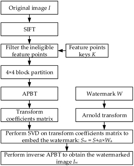 The procedure of watermark embedding based on SIFT, SVD, and APBT is shown in Figure 5.