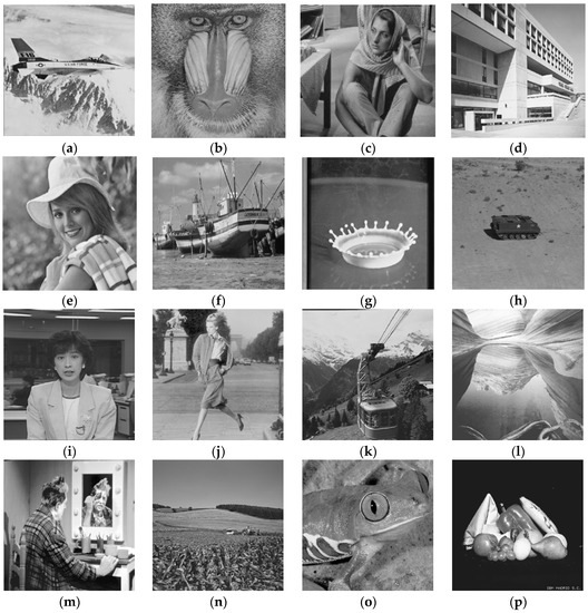 Tested images: (a) Airplane; (b) Baboon; (c) Barbara; (d) Bank; (e) Elaine; (f) Barche; (g) Milkdrop; (h) Panzer; (i) Announcer; (j) Vogue; (k) Cablecar; (l) Canyon; (m) Clown; (n) Cornfield; (o) Frog; (p) Fruits.