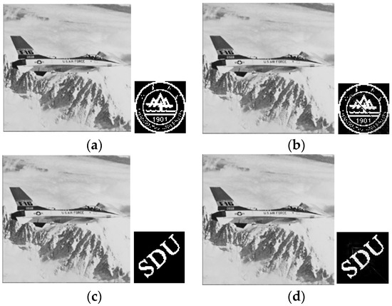 To give more detailed results, the Airplane image and Shandong University logo are taken as examples for further demonstration. Table 2 indicates the PSNR and NC comparison among methods proposed by Jain et al. [30], Zhang et al. [31], Fzali and Moeini’s scheme [32], and the proposed algorithm. In [30], principal components of the watermark are embedded into the host image. In [31], the watermark is scrambled by shuffled SVD (SSVD), and principal components are extracted for watermark embedding. In [32], the watermark is embedded into singular values of the DCT coefficients matrix, which is derived from four segmented sub-images in the DWT domain.