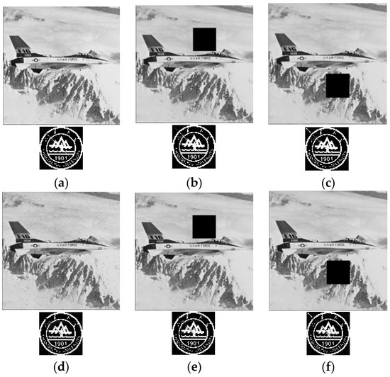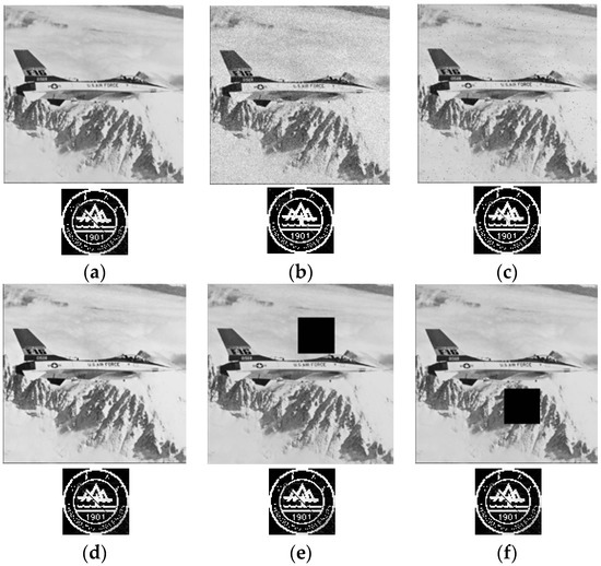 Moreover, the watermarked image will suffer various types of attacks in the transmission procedures. The performance of the APDCBT-based algorithm is presented in Figure 8, in which (a–f) are watermarked images and extracted watermarks based on APDCBT after five types of attacks: Gaussian noise (0, 0.01), salt and pepper noise (0.01), JPEG compression (QF = 100), cropping the sparse region (100 × 100), and cropping the dense region (100 × 100), which are labeled as 2 to 6, respectively. Furthermore, the result with no attack is labeled as 1.
