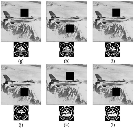 APDCBT-based watermarked images and extracted watermarks under combinations of different attacks: (a) 2 and 4; (b) 2 and 5; (c) 2 and 6; (d) 3 and 4; (e) 3 and 5; (f) 3 and 6; (g) 4 and 5; (h) 4 and 6; (i) 2, 4, and 5; (j) 2, 4, and 6; (k) 3, 4, and 5; (l) 3, 4, and 6.