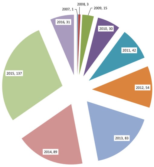 The quality issue in VGI data is a clear challenge. Rigorous and longitudinal studies are required for creating trust in OSM data. There have been numerous research studies in recent years. Figure 1 presents the data of 485 papers collected from various bibliographic databases, such as the IEEExplore, Springer, MDPI, Mendeley and Zotero repositories. A review of these articles shows that many of them reported on the assessment of OSM data. In these studies, the quality of data has been judged based on the context of their application, which is a function of intangible properties represented using quality indicators [,]. Quantitative dimensions shared with GI review the completeness, logical consistency, positional, temporal and semantic consistency. Non-quantitative dimensions review lineage, purpose, usage and constraints. Further, dimensions exclusive for VGI review the believability, compliance and convergence []. The following sections discuss the related work by researchers to assess the completeness, attribute accuracy and semantic accuracy using intrinsic data quality indicators.
