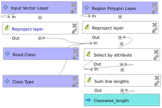 As discussed in Section 2, the completeness of the data is vital to justify the fitness of data for various GI application domains. The network length assessment is an important intrinsic indicator to assess the completeness of road networks []. The processing model developed (Figure 2) requires two types of input: (1) the network graph; (2) the polygon layer of smaller regions with the region ID field. This model was used to calculate the length of roads class-wise as suggested by Graser et al. []. Firstly, the input graph was re-projected to a suitable coordinate system. Thereafter, the class-wise road network was extracted and presented to the “sum line lengths” processing algorithm to find road network statistics. OSM data contain many classes for “highway” tags (http://wiki.openstreetmap.org/wiki/India:Tags/Highway, accessed on 2 March 2017) with few classes representing links for connecting a higher order road from/to a lower order road. For example, trunk_link connects the trunk to/from the primary road. In the current study, for calculating the network length class-wise, the “links” were considered part of the same class of which they are represented, i.e., trunk_link would be considered as the same as trunk class [].