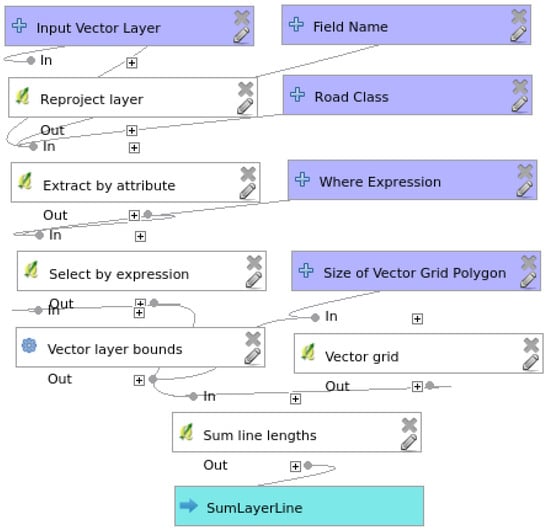 QGIS (Version 2.8.6) [] is an open source GIS software and utilizes an object-oriented Python framework called the processing toolbox. This toolbox provides the ability to extend the capabilities of existing algorithms []. The PYQGIS bindings allow comfortable integration of Python code with Qtlibraries and eventually with QGIS. Further, the processing toolbox provides a graphical modeler for automating the complex workflow management of algorithms. The methodology used for the assessment of OSM data was developed in Python as processing scripts. These scripts were further used as components in the graphical modeler. The following section discusses the processing models developed to perform intrinsic quality assessment.