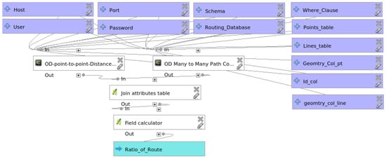 This model (Figure 5) took two inputs: (1) routable graph; (2) points (origin-destination) data table. The first component created a matrix of origin-destination direct distances using the haversine algorithm; whereas, the second component created a matrix for the shortest routable distances between origin-destination points data using the Dijkstra algorithm. The outcomes of the point-to-point and shortest distance algorithm were given to the “joining attribute table” processing algorithm, for joining these tables based on the common parameter. Further, a field calculator was used to find the ratio of the shortest distance and point-to-point distance. The last component, based on the heuristic parameter, calculated the number of non-navigable routes due to the error of omission or incompleteness.