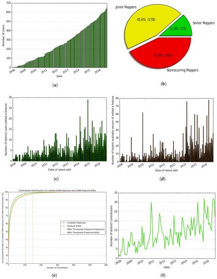 The history data used for assessment were prepared as discussed in Section 4.1. The model was developed for answering specific questions as outlined earlier. The Python script “development of contributors” was developed to find the number of contributors. This script read the history table of line features in the PostgreSQL database and identified and returned a list of contributors date-wise. The classification of contributors was done based on the number of edits made by them. Hence, the script provided more in-depth information about each user. The results were grouped by classifying three types of contributors: “senior-mappers”, “junior-mappers” and “non-recurring-mappers”, as suggested by Neis and Zipf []. The calculation was based on that these parameters may be prejudiced, as one mapper could be less active in a certain area while being very active in other areas. Thus, classification provided the rough estimate about the active members in the region. The script “contributors and their cumulated percentage of contributions” calculated the total amount and percentage of node-contributions by each contributor.