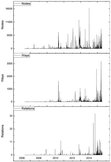 The model (Figure 4) was used to assess the history file of the area under examination. The analysis concluded that a total of 611 users (Figure 7a) have contributed through the period 2007 to 2016. They have contributed 634,173 nodes, 86,176 ways and 393 relations with very the first node added in September 2007. Figure 8 presents the historical development of three components of OSM data, whereas Figure 9 depicts the changes in OSM data over the years. Further, by analyzing the user contribution count, the categories of user are classified as suggested by Neis and Zipf []. Figure 7b depicts the graphical count of the class of contributor and calculated that 45.6%, 11.9% and 42.5% as junior, senior and non-recurring mappers exist for data under investigation. Figure 7f presents the number of active distinct contributor’s and provides a graphical analysis about the user activity in the region. Further, Figure 7e reveals the relationship between user feature edits and their percentage contributions.
