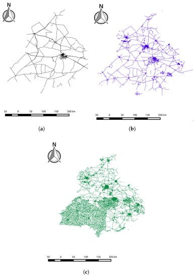 Punjab OSM road network analysis over the years. (a) March 2008; (b) August 2012; (c) December 2016.