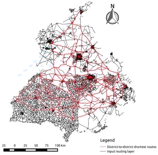 The model (Figure 5) used for the assessment of road navigability accepted two inputs: (1) routing network; (2) origin-destination points table. The origin-destination points dataset was prepared using the geocode plugin in QGIS, which uses Nominatim geocode services, to acquire the POIs for all districts of Punjab (India). The two inputs were given to the two components of the model, for finding the shortest OSM map distances (Figure 10) and direct distances between the points. In order to validate the results, a Python script was developed using the Google map distance matrix API to find the shortest routing distance between the same set of origin-destination points. Figure 11a,b present the plots of heuristic relative error used to measure the variation of shortest distances from direct distances obtained on OSM and Google maps, respectively. It was found that in the case of the district-to-district-based origin-destination matrix, nearly 69 routes had a distance more than 20% of the direct distances. Few longer routes were attributed to data preparation, as the neighboring state’s network was not included. Therefore, particularly for the district Pathankot, the routes were 30% to 40% longer approximately. As per the outcome of the model, it is concluded that the completeness of the primary roads was quite satisfactory, but other types of roads are less complete.