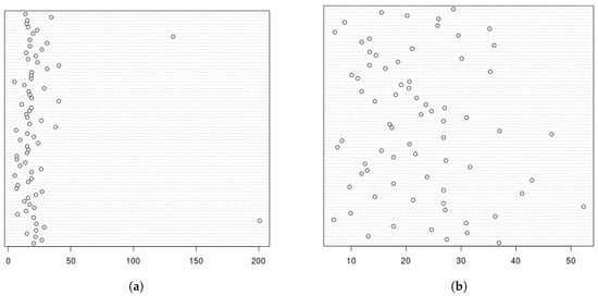 Dot plots of relative difference (if more than 20%) of the shortest distances and direct distances. (a) OSM routing distances; (b) Google routing distances.